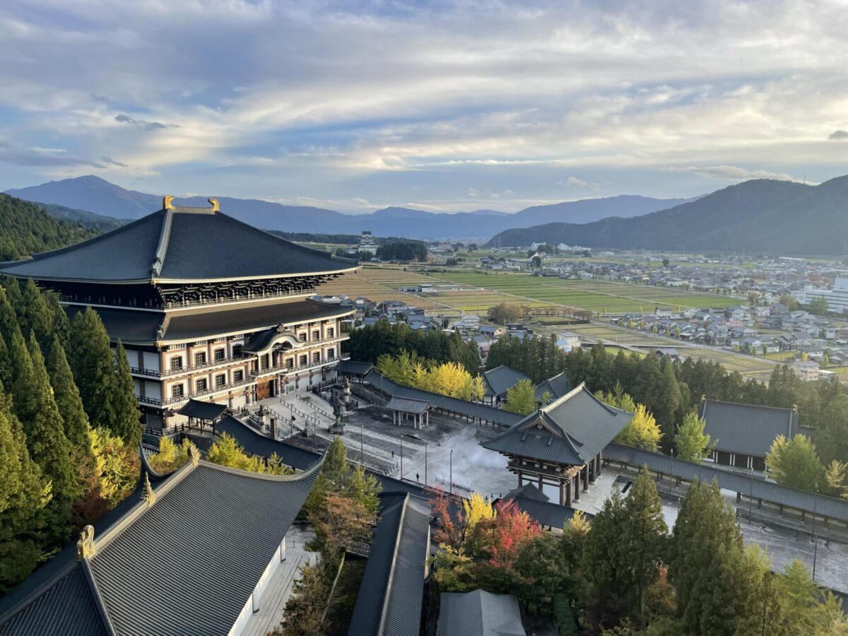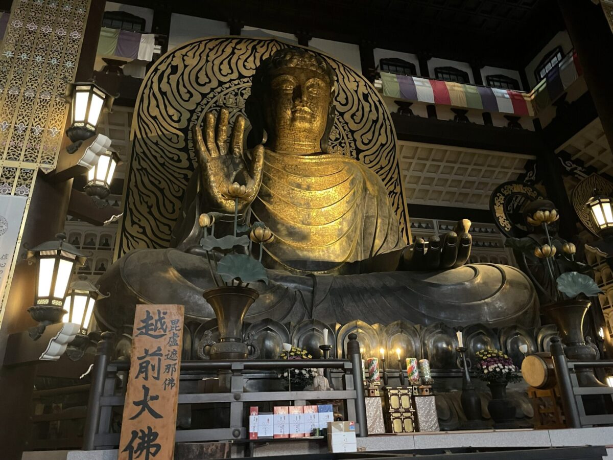 Kami juga mengunjungi Echizen Daibutsu di Kuil Daishiyama Seidaiji, rumah bagi pagoda 5 lantai yang menakjubkan dan salah satu patung Buddha duduk terbesar di Jepang. Di dalam aula kuil yang luas, patung emas berkilau lembut di bawah cahaya, dikelilingi oleh barisan Buddha yang lebih kecil. Skala yang ada merupakan pengingat yang menakjubkan bahwa semangat pengerjaan Katsuyama juga meluas ke pengabdian dan tempat ibadahnya.